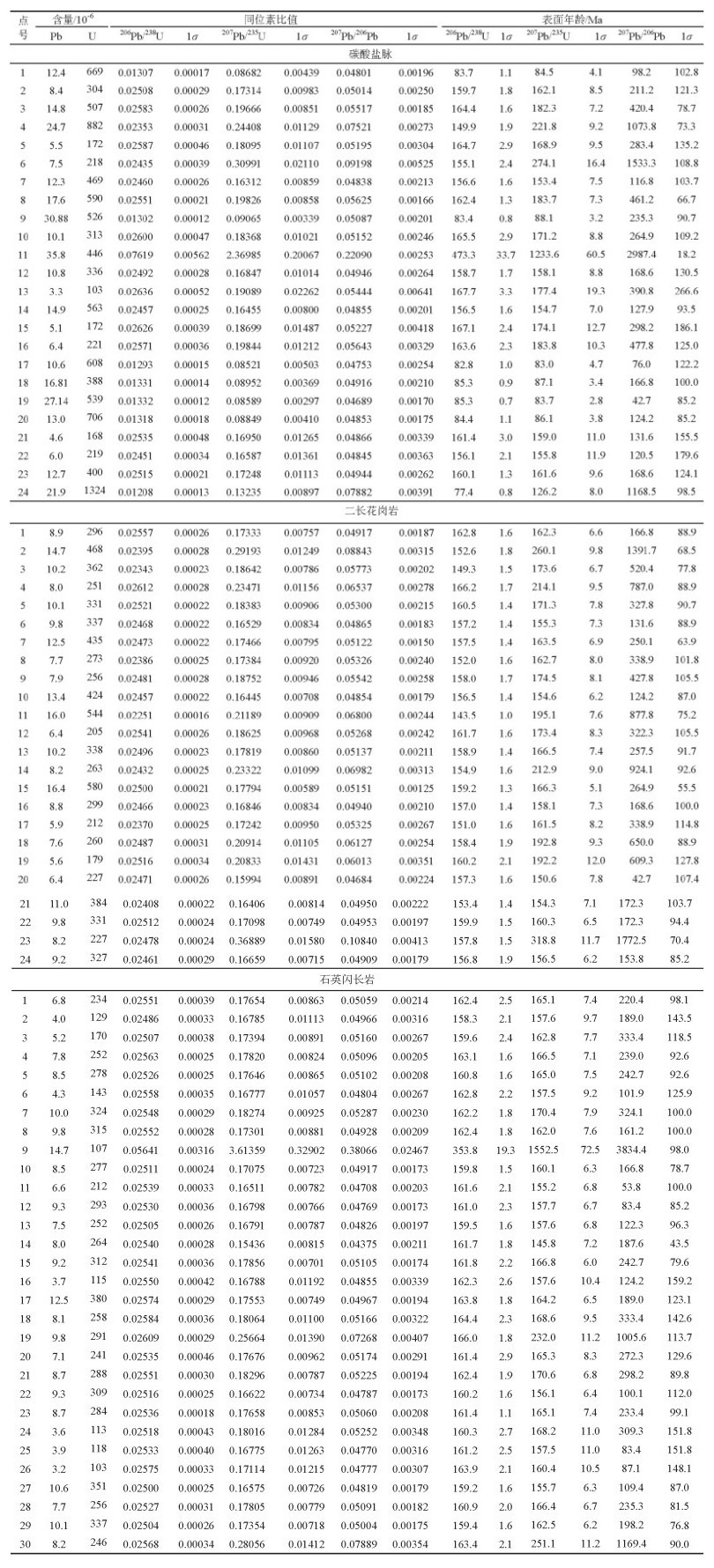 表 2 乌鲁穷同构造碳酸盐脉、二长花岗岩、石英闪长岩的锆石LA-ICP-MS U-Pb测年结果 Table 2 Zircon LA-ICP-MS U-Pb dating results of the isostructural carbonate veins, adamellite and quartz diorite from Wuluqiong |