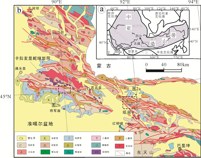 图 1 新疆东准噶尔卡拉麦里构造带地质简图 a—中亚构造区划图(据Jahn, 2004);b—新疆东准噶尔卡拉麦里构造带地质简图(据新疆维吾尔自治区地质矿产局,1993修改) Fig. 1 Simplified tectonic geological map and regional geological sketch map a-Tectonic map of the Central Asian Orogenic Belt (CAOB) (after Jahn, 2004); b-Geological sketch map of Karamaili tectonic zone in East Junggar, Xinjiang(modified from BGMRXUAR, 1993) |