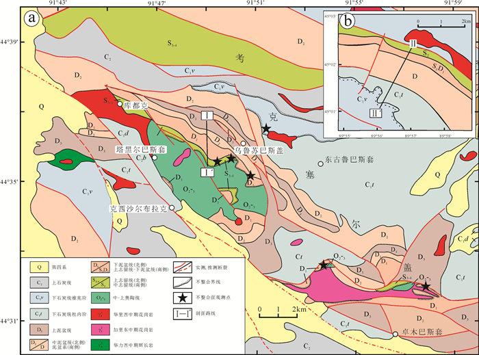 泥盆系在北侧分布较广,发育完好(图 2a)。下泥盆统(未分组)为一套富含钙质的碎屑岩及碳酸盐岩沉积,其上与中泥盆统乌鲁苏巴斯套组为整合过渡关系,其下多处不整合覆盖在中—上奥陶统荒草坡群和加里东中期花岗岩之上。中泥盆统乌鲁苏巴斯套组主要由岩屑砂岩、凝灰岩和凝灰质砂岩及生物礁灰岩组成。上泥盆统克安库都克组与下伏中泥盆统乌鲁苏巴斯套组及上覆下石炭统黑山头组均为整合接触,为一套火山碎屑岩夹陆源碎屑岩沉积。