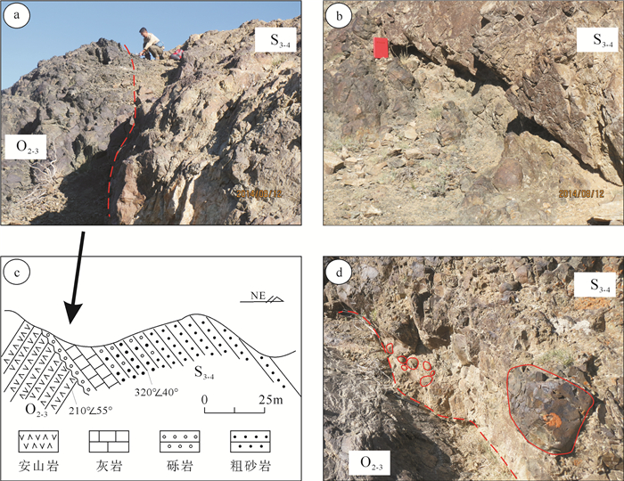 3.1 不整合面分布及其特征 3.1.1 上志留统考克赛尔盖组与中—上奥陶统荒草坡群角度不整合上志留统考克赛尔盖组与其下伏奥陶系荒草坡群之间的角度不整合主要分布在纸房以北塔黑尔巴斯套以东(图 2a,图 3a~c),不整合界面之上的上志留统砾岩呈紫红色,指示陆表暴露的氧化环境。砾石呈半棱角状—滚圆状,分选一般,大小自数厘米至数十厘米不等,个别达1~2 m(图 3d)。砾石成分几乎全为下伏英安斑岩、石英斑岩及安山玢岩等,砂质碎屑胶结,具底砾岩特征。底砾岩厚度为3~10 m,盖在凹凸不平的不整合面之上。下伏安山岩产状为210°∠55°,底砾岩之上为灰紫色含砾生物碎屑灰岩和黄绿色砂岩,产状为320°∠40°,灰岩中含大量的海百合茎和珊瑚等化石(图 3b)。在上志留统覆盖之下,紧靠其底部不整合接触带处岩石已变成浅黄绿色,推测是古风化作用的结果(图 3d)。