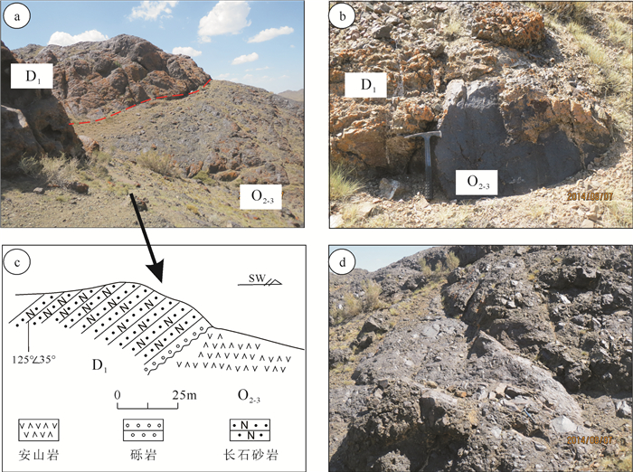 在纸房以北乌鲁巴斯套南东2 km附近,下泥盆统不整合超覆在中—上奥陶统荒草坡群灰黑色安山岩之上(图 2a,图 4a~c)。底部为砾岩,砾石成分多为安山岩,大小不均,自数厘米至数十厘米,半棱角状—滚圆状,砂质碎屑胶结(图 4d)。底砾岩几乎沿不整合面均可见到,或盖在凹凸不平的不整合面之上,或充填在不整合面上的裂隙中(图 4b)。在现代剥蚀残山上,尚有大量残余露头(图 4d)。不整合面之上为黄绿色厚层钙质砂岩、岩屑砂岩,产状为125°∠35°(图 4a)。