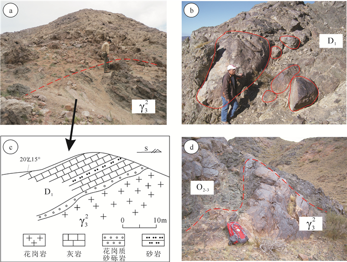 图 5 下泥盆统与加里东期花岗岩角度不整合接触 a—下泥盆统不整合覆盖在加里东期花岗岩之上,形成一种外貌酷似花岗岩的花岗质砂砾岩; b—花岗岩之上直接覆盖着厚数米的花岗质巨砾岩和砾岩; c—下泥盆统与加里东期花岗岩角度不整合关系图; d—加里东期花岗岩侵入中—晚奥陶纪地层 Fig. 5 The angular unconformity between Lower Devonian and Caledonian granitoids a-Lower Devonian strata overlying Caledonian granitoids unconformably, forming granitic conglomerates with granitoid features; b-Meters of granitic conglomerates directly covering the underlying Caledonian granitoids; c-The angular unconformity between Lower Devonian and Caledonian granitoids; d-Caledonian granitoids that intruded into the Middle-Upper Ordovician |