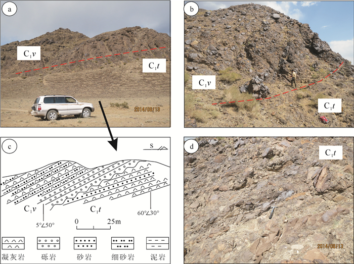 图 6 下石炭统杜内阶与维宪阶之间角度不整合接触 a—维宪阶不整合于杜内阶之上; b—不整合面之上巨厚的底砾岩层; c—维宪阶与杜内阶间角度不整合关系图; d—不整合面之下杜内阶地层,以玻屑晶屑砂岩夹薄层砂岩为主 Fig. 6 The angular unconformity between Tournaisian and Visean a-Visean overlying Tournaisian unconformably; b-Huge basal conglomerates above the unconformable surface; c-The angular unconformity between Tournaisian and Visean; d-The Tournaisian composed of crystal sandstone interbedded with flagstone |
