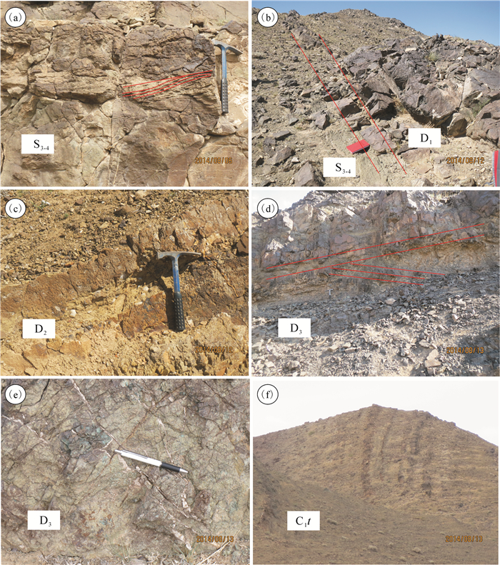 图 7 卡拉麦里蛇绿岩带北侧沉积特征 a—上志留统中发育小型交错层理;b—连续沉积的下泥盆统与上志留统;c—中泥盆统中含丰富的底栖生物化石;d—上泥盆统中发育大型交错层理;e—上泥盆统上部粒度变粗,岩性过渡为凝灰质砾岩;f—杜内阶,以薄层凝灰岩为主 Fig. 7 The sedimentary characteristics on the north side of the Karamaili ophiolitic belt a-Small cross-bedding developed in Upper Silurian; b-Continuous sediments from Upper Silurian to Lower Devonian; c-Abundant kinds of benthic fossils in Middle Devonian; d-Large cross-bedding developed in Upper Devonian; e-Tuffaceous conglomerates with coarse grains developed in the upper part of Upper Devonian; f-Tournaisian dominated by thin bedded tuff |