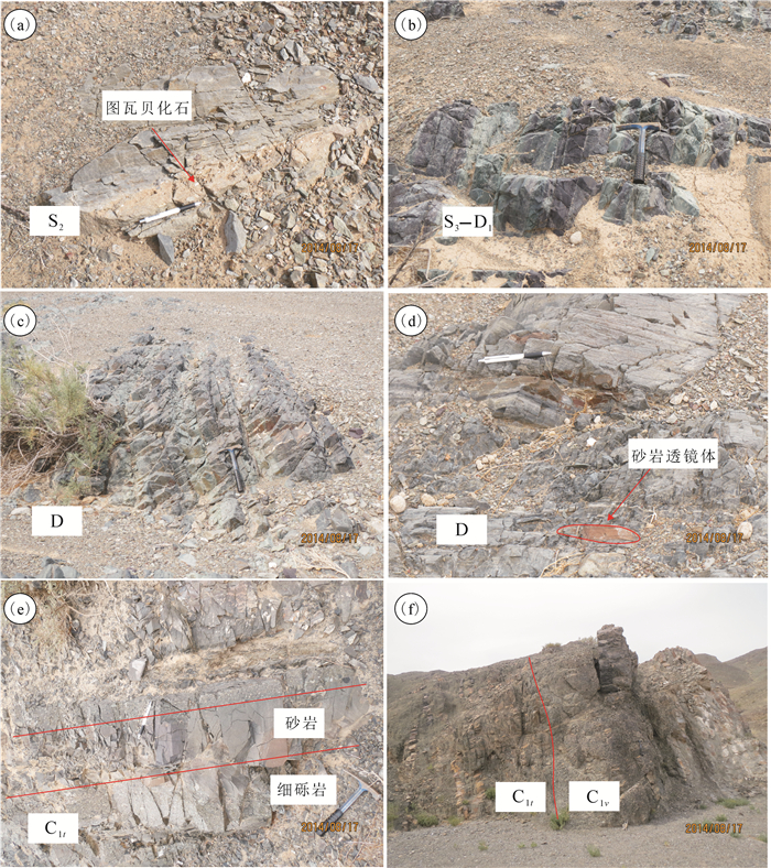 图 8 卡拉麦里蛇绿岩带南侧沉积特征 a—含图瓦贝化石的中志留统;b—色调鲜艳的上志留统—下泥盆统;c—泥盆系下部,以中层的凝灰岩为主;d—泥盆系上部以砾岩为主夹砂岩透镜体;e—粗粒度的下石炭统杜内阶;f—维宪阶巴塔玛依内山组火山岩地层不整合于杜内阶之上 Fig. 8 The sedimentary characteristics on the south side of the Karamaili ophiolitic belt a-The Tuvaella fossils in Middle Silurian; b-The bright Upper Silurian-Lower Devonian; c-The lower part consisting of middle-bedded tuff in Devonian; d-Conglomerates with a few packs and lenses developed in the upper part of Devonian; e-The coarse grains in Carboniferous Tournaisian; f-The Visean batamayinieshan Formation unconformably overlying the Tournaisian |