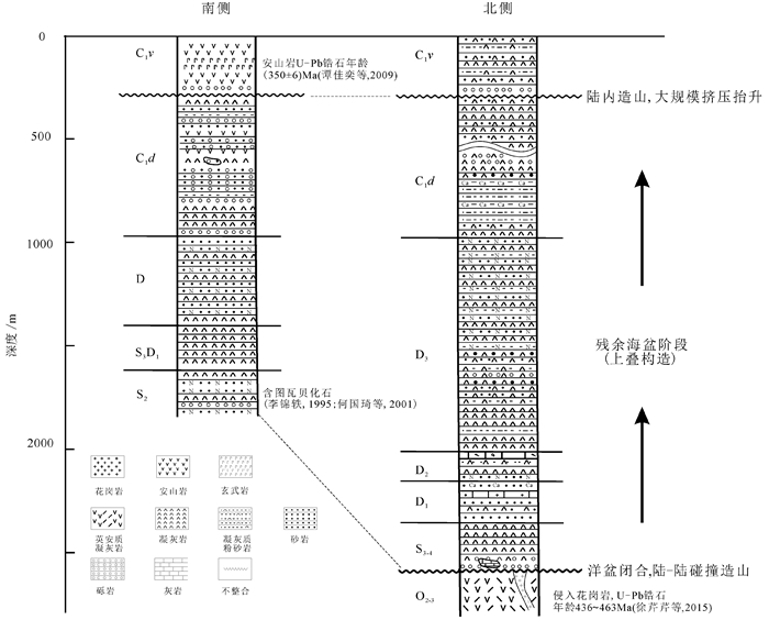 图 9 卡拉麦里蛇绿岩带南北两侧古生代地层柱状剖面对比图 Fig. 9 Paleozoic stratigraphic correlation of the two sides of Karamaili ophiolitic belt |