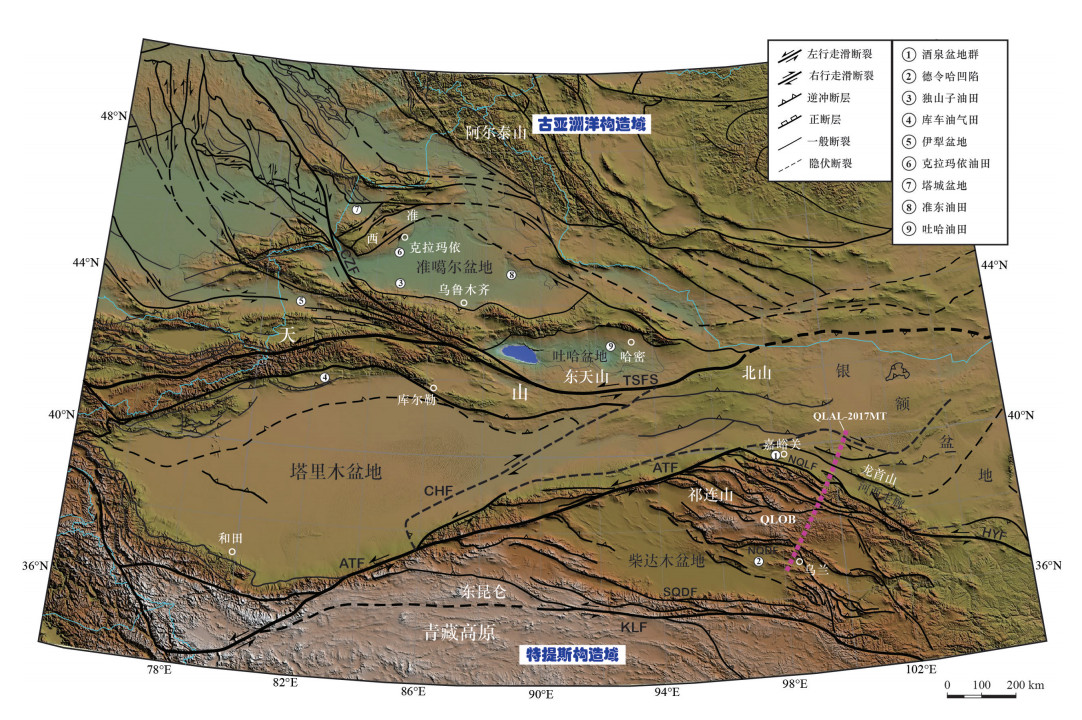 图 2 中国西北及周边地区断裂构造体系略图(据陈宣华等,2019a修改) TSFS—天山走滑断裂系统;ATF—阿尔金断裂;CZF—成吉斯—准噶尔断裂;KLF—昆仑断裂;CHF—车尔臣河断裂;SQDF—柴达木南缘断裂;NQDF—柴达木北缘断裂;NQLF—祁连山北缘断裂;HYF—海原断裂;图中给出超宽频大地电磁测深剖面(QLAL-2017MT)的位置 Fig. 2 Sketch map of the fault system of Northwest China and surrounding areas (modified from Chen Xuanhua et al., 2019a) TSFS- Tianshan strike-slip fault system; ATF- Altun Fault; CZF- Chingiz-Junggar Fault; KLF-Kunlun Fault; CHF- Cheerchen Fault; SQDF- South Qaidam Fault; NQDF- North Qaidam Fault; NQLF- North Qilian Fault; HYF- Haiyuan Fault. The location of super-broadband magnetotelluric sounding profile (QLAL-2017MT) is shown in Fig. 2 |