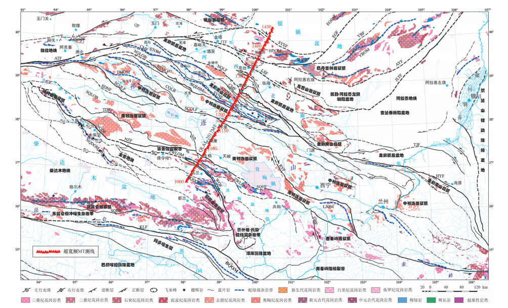 图 3 祁连造山带及周缘断裂构造体系略图 SQLOB—南祁连造山带;CQLB—中祁连地块;NQLOB—北祁连造山带;ATF—阿尔金断裂;KLF—昆仑断裂;NQDF—柴达木盆地北缘断裂;SDNF—党河南山南缘断裂;TDF—土尔根达坂断裂;NZF—北宗务隆山断裂;SQHF—青海南山断裂;SCQLF—中祁连南缘断裂;NCQLF—中祁连北缘断裂;SYNF—野牛沟南缘断裂;CMF—昌马—俄博断裂;NQLF—祁连山北缘断裂;HYF—海原断裂;TJF—天景山断裂;WQF—温泉断裂;RYF—日月山断裂;GHF—共和断裂;LSF—龙首山断裂;JTF—金塔断裂;AYF—阿拉善右旗断裂;YBF—雅布赖断裂;EGF—恩格尔乌苏南缘断裂;SYEF—银额盆地南缘断裂。图中给出超宽频大地电磁测深剖面(QLAL-2017MT)的位置 Fig. 3 Sketch map of the fault system of the Qilian Mountain Orogenic Belt and its adjacent areas SQLOB-South Qilian Orogenic Belt; CQLB-Central Qilian Block; NQLOB-North Qilian Orogenic Belt. ATF-Altun Fault; KLF-Kunlun Fault; NQDF-North Qaidam Fault; SDNF-South Danghe Nan Shan Fault; TDF-Tuergendaban Fault; NZF-North Zongwulong Shan Fault; SQHF- South Qinghai Fault; SCQLF-South Central Qilian Fault; NCQLF-North Central Qilian Fault; SYNF-South Yeniugou Fault; CMF- Changma-Ebo Fault; NQLF-North Qilian Fault; HYF- Haiyuan Fault; TJF-Tianjingshan Fault; WQF-Wenquan Fault; RYF-Riyueshan Fault; GHF- Gonghe Fault; LSFLongshoushan Fault; JTF- Jinta Fault; AYF-Alxa Right Banner Fault; YBF- Yabulai Fault; EGF-South Engeerwusu Fault; SYEF-South Yin' e Fault. The location of super-broadband magnetotelluric |