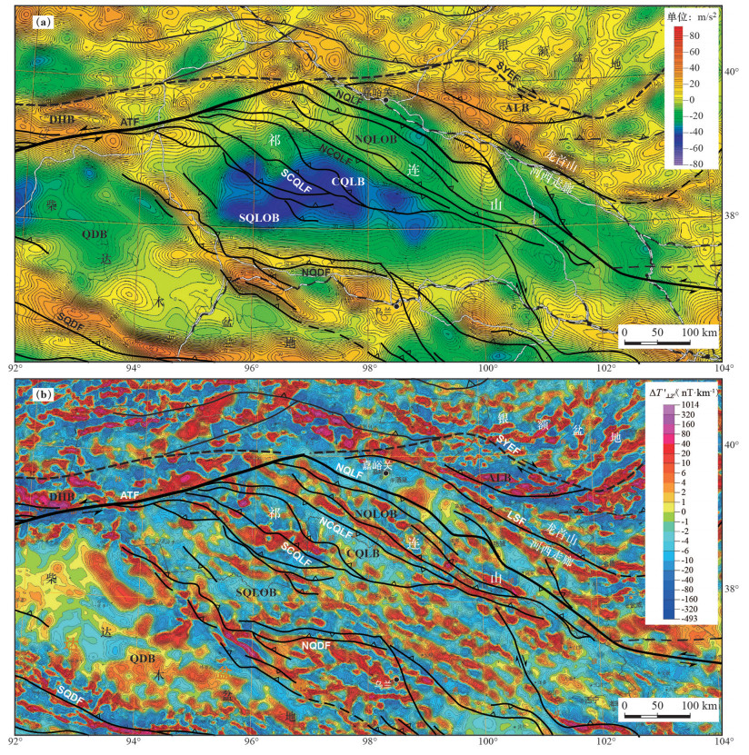 图 4 祁连山及周缘地球物理场异常及其与断裂构造体系的关系 a—剩余重力异常及其与断裂构造体系的关系,剩余重力异常据冯治汉等(2018);b—航磁∆T场化极垂向一阶导数异常及其与断裂构造体系的关系,航磁∆T场化极垂向一阶导数异常据熊盛青等(2015);ALB—阿拉善地块;NQLOB—北祁连造山带;CQLB—中祁连地块;SQLOB—南祁连造山带;QDB—柴达木地块;DHB—敦煌地块 Fig. 4 Sketch maps showing the relationships between the geophysical field anomalies and the fault system in the Qilian Mountain and surrounding areas a-Residual gravity anomaly (after Feng Zhihan et al., 2018) and its relationship with fault system; b-First vertical derivative anomaly of the aeromagnetic ∆T field polarization (after Xiong Shengqing et al., 2015) and its relationship with fault system; ALB-Alxa Block; NQLOB-North Qilian Orogenic Belt; CQLB- Central Qilian Block; SQLOB-South Qilian Orogenic Belt; QDB-Qaidam Block; DHB-Dunhuang Block |
