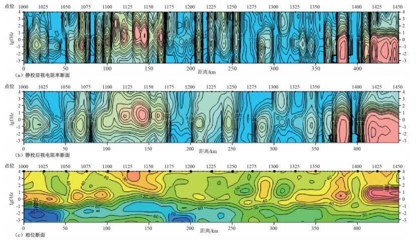 利用相位断面可以判断视电阻率静态改正的合理性。相位剖面等值线的横向变化可定性确定地层的起伏变化及断裂位置。在视电阻率剖面上(图 5a,图 5b),等值线横向分段特征明显,呈高阻、低阻相间分布的特征;在纵向上,有的显示低-高-低三层电性特征,有的显示高-低-高-低四层电性特征。由趋肤深度推断,在0.1 Hz附近相对连续的一套相对高阻层,是壳内高阻基底,该套层的厚度定性反映了高阻基底的厚度。而在该套高阻层下,出现一套相对连续的低阻,推测为壳内高导层。在1080、1170、1270、1350、1400等测点附近,剖面等值线突变,呈陡直状,推测为大型断裂的反映。相位断面形态(图 5c)与视电阻率具有较好的一致性;由于相位不受静态效应影响,其形态在横向上更加连续。
