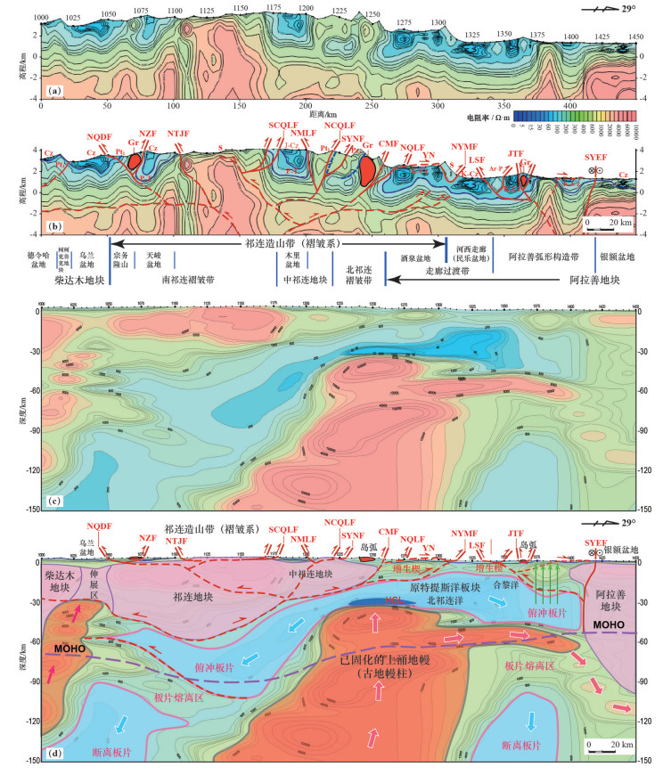 在双向俯冲的大洋板片下部,大型柱状高阻电性体一直向下延伸至上地幔深部,可能具有已固化的上涌古地幔柱的构造特征,推测为早古生代北祁连洋板块在南、北两个方向上进行双向俯冲的深部动力来源;上涌地幔大致在MOHO面深度出现向北的水平底辟扩展特征,并分割了向北俯冲的原特提斯洋板片。在剖面南部的柴达木地块与南祁连造山带交接部位,同样存在古老的地幔物质上涌构造残余,并在柴达木地块与南祁连造山带接触区域形成伸展变形区,但地幔上涌的规模较小,可能是该地区晚石炭世—二叠纪大陆裂谷与夭折了的宗务隆有限洋盆形成演化的深部记录。