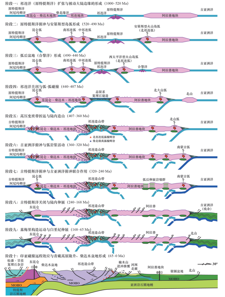 6.2 构造变形与构造演化祁连造山带经历了早古生代原特提斯洋发育以来的构造演化,是青藏高原东北缘高原隆升与扩展的关键构造带。综合研究表明,祁连造山带可能经历了以下多个阶段的构造演化(图 7)。