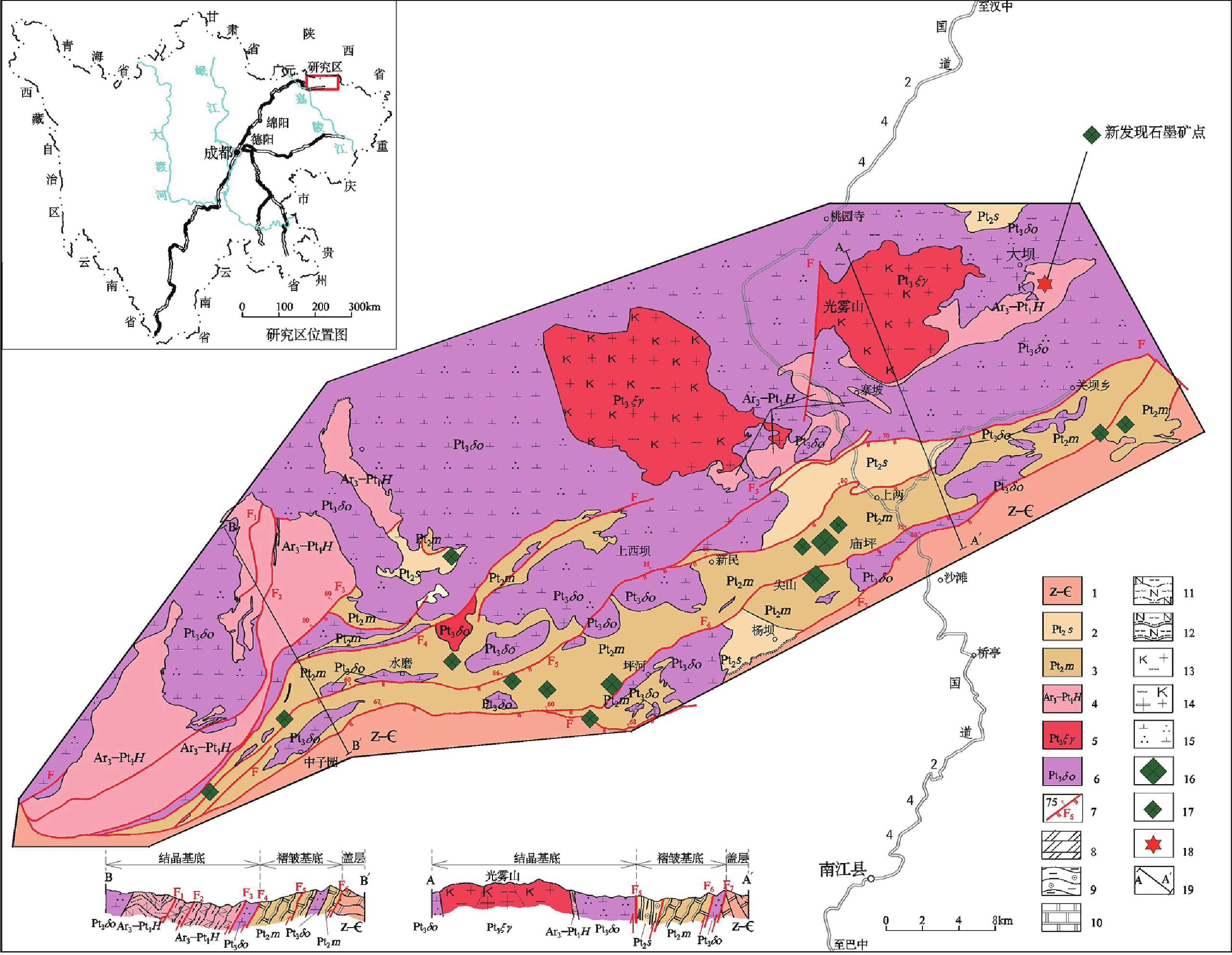 1 IntroductionIn China, regional metamorphic graphite deposits are mainly distributed on the periphery of ancient platforms and blocks, for instance, those found at Xinghe, Inner Mongolia, Nashu, Shandong, and Beizishi, Lushan County, Henan, on the northern, eastern and southern margins of the North China Platform, respectively; and Zhongba, Panzhihua, Sichuan, and Sanchaya, Yichang, Hubei, on the western and northern margins of the Yangtze Platform (Li C et al., 2015). In the north of China, graphite deposits mostly occur in crystalline basements (Liu JZ et al., 1989; Mo RJ et al., 1989; Li HB and Zhang B, 2014; Li C et al., 2015; Liu JD and Xiao RG, 2015; Sun HJ et al., 1995; Yang PQ et al., 2017), and less so in epimetamorphic rock series. In south China, graphite deposits found on the Yangtze Platform mainly occur in fold basements (Gao XZ, 2015; Wang HJ et al., 2017; Xia JS et al., 2017a, b; Ma CF et al., 2018; Ma ZX et al., 2018), for instance those at: Zhongba in the Yanbian Group complex, Panzhihua, Sichuan; Qujie in the Julin Group complex, Mouding, Yunnan; and Jianshan, Pinghe and Miaoping in the Huodiya Group complex, Nanjiang, Sichuan. Graphite deposits mainly are generated from regional and structural metamorphism whereas carbon comes from organic matter (Ma ZX et al., 2018). “Crystalline basement crystalline graphite deposit in the north margin of upper Yangtze” is the outcome of the sub-project “Guanba-Nanjiang geological survey in Nanjiang, Sichuang” under the China Geological Survey (CGS) geological survey project “Tongan–Ninglang Geological Mineral Survey in Longmen Mountain–Central Yunnan Metallogenic Zone” undertaken by the CGS Chengdu Geological Survey Center. The project completed 1:50 000 mineral-survey geological mapping, stream sediment measurements and remote-sensing geological interpretation, at 840 km2 each (2 map sheets: Guanba and Nanjiang) and examined mineral points discovered or delineated, such as Laiyiliang, Daba, Xinli, Xiongjiawan and Yuquan, or anomalies therein. Through the mineral geological survey done in Nanjiang, in north Sichuan, the project discovered crystalline graphite deposits in the Houhe Group complex of the crystalline basement.