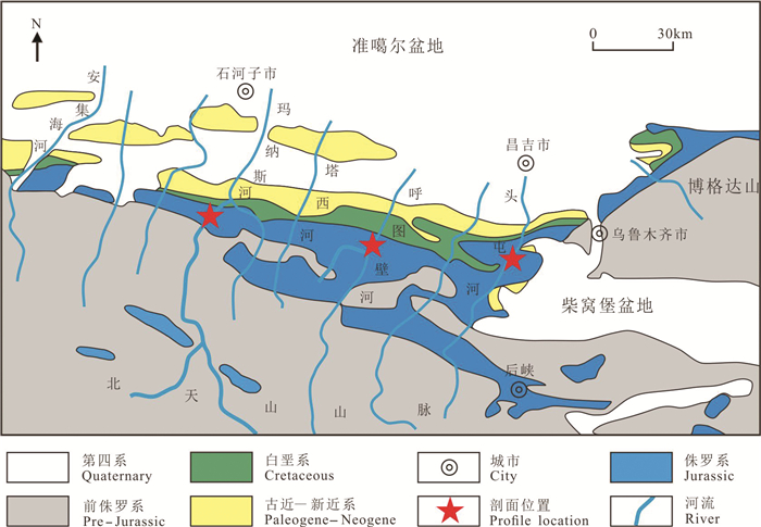 准噶尔盆地南缘侏罗系地层自下而上可划分为下侏罗统八道湾组(J1b)、三工河组(J1s);中侏罗统西山窑组(J2x)、头屯河组(J2t);上侏罗统齐古组(J3q)、喀拉扎组(J3k)(图 2)。准噶尔盆地由弱伸展拗陷向挤压性盆地的转变造成了西山窑组与头屯河组之间的不整合接触(白斌,2008)。中、上侏罗统头屯河组至喀拉扎组在南缘西段连续沉积,上下地层整合接触;喀拉扎组与上覆白垩系清水河组不整合接触。因此可将南缘头屯河组至喀拉扎组作为一个连续沉积的整体开展沉积特征、沉积模式演化等相关研究,分析在缺乏区域性构造运动下,造成连续沉积地层上下沉积特征差异的原因。本次研究选取了交通相对比较便利的头屯河剖面、呼图壁河剖面和红沟剖面进行实地测量。