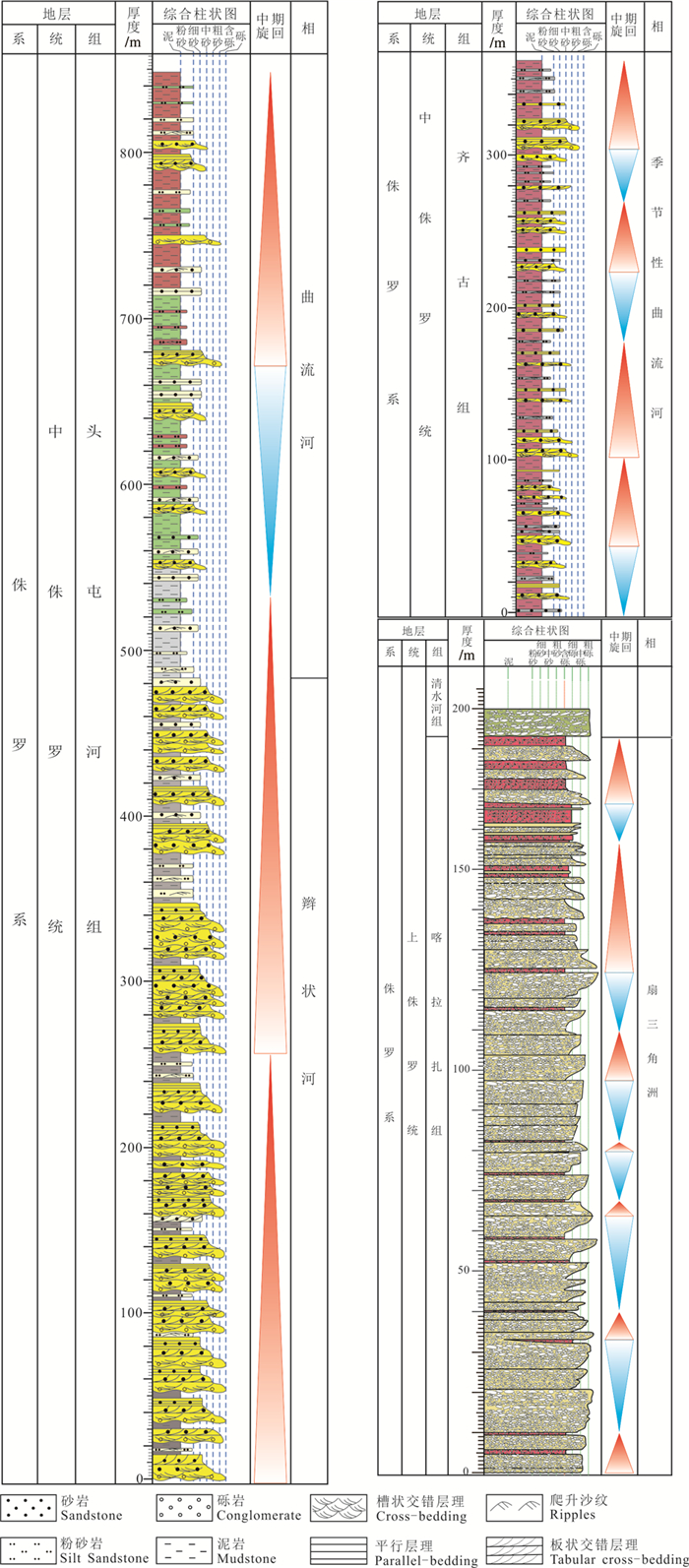 6 结论(1)准噶尔盆地南缘西段中、下侏罗统发育3种不同的沉积体系:①底部头屯河组早期发育辫状河沉积体系,随后多条辫状河道合并逐渐向曲流河转变,后期过渡为曲流河沉积体系,沉积物粒度、砂泥比、沉积构造规模等不断减小;②中部齐古组发育季节性曲流河沉积,河道侧积作用强烈,褐红色沉积,半干旱环境;③上部喀拉扎组发育干旱型扇三角洲沉积,红褐色砾岩为主,干旱的沉积环境造成高密度碎屑流沉积更为发育。