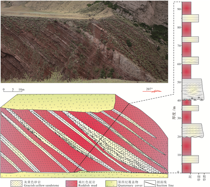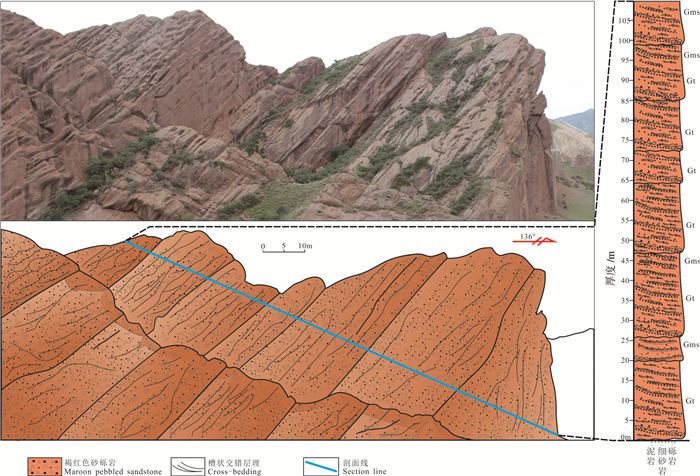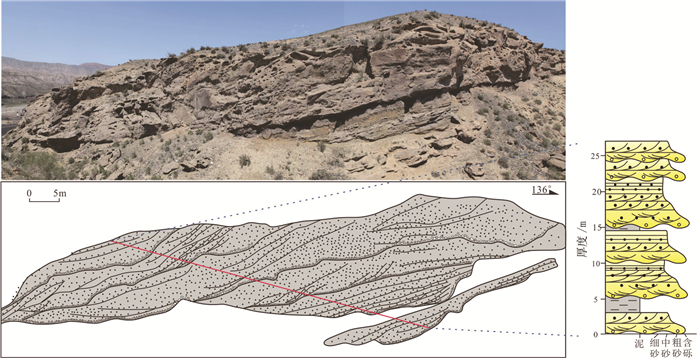 图 6 喀拉扎组中部砂体精细解析与地质素描图 Fig. 6 The geological sketch and anatomy of outcrop profile in middle part of Kalazha Formation |