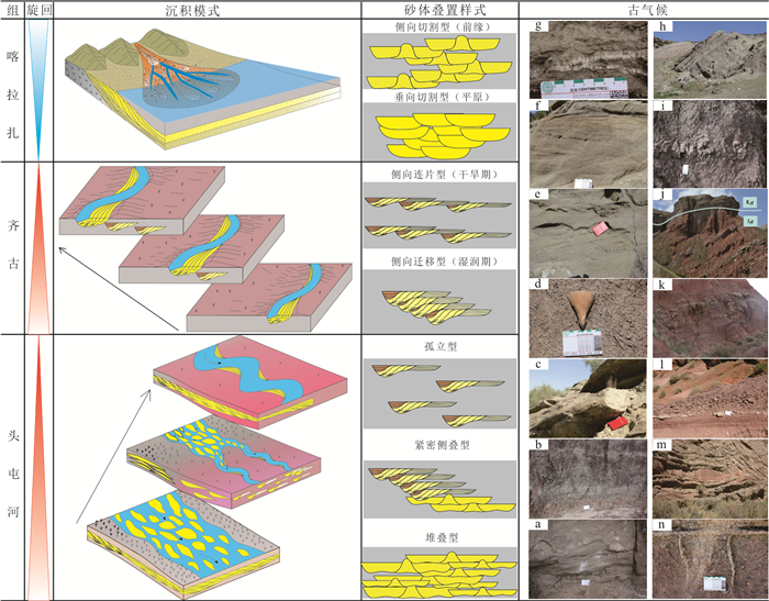 图 7 准南中、上侏罗统沉积体系演化、砂体叠置方式与古气候标志 a—头屯河组下部灰色砂岩;b—头屯河组下部炭质泥岩;c—头屯河组硅化木;d-头屯河组叠锥石;e—头屯河组中部灰绿色砂岩;f—头屯河组上部灰黄色砂岩;g—头屯河组石膏;h—头屯河组顶部浅灰色砂岩与紫红色泥岩互层;i—头屯河组上部钙质条带;j—齐古组褐红色泥岩与灰绿色砂岩;k—齐古组褐红色泥岩与灰黄色砂岩;l—齐古组石膏;m—喀拉扎组褐红色砾岩;n—喀拉扎组干裂构造 Fig. 7 Sedimentary system evolution, sand body superposition and paleoclimate signs of the Middle and Upper Jurassic in the southern margin of Junggar Basin a- Sandstone in lower part of Toutunhe Formation; b- Carbon mudstone in lower part of Toutunhe Formation; c- Turtunhe Formation silicified wood; d- Turtunhe Formation Cone-in-cone stone; e- Grey-green sandstone in middle part of Toutunhe Formation; f- Pale yellow sandstone in upper part of Toutunhe Formation; g-Gypsum in Toutunhe Formation; h-pale-grey sandstone and amaranth mudstone ionterbedded in top part of Toutunhe Formation; i- Calcium stripe in upper part of Toutunhe Formation; j-Maroon mudstone and pale-green sandstone in Qigu Formation; kMaroon mudstone and grayish yellow sandstone; l-Gypsum in Qigu Formation; m-Maroon conglomerate in Kalazha Formation; n-Exposure structure in Kalazha Formation |