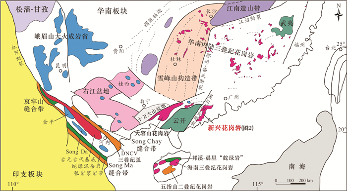 大容山花岗岩(260~250 Ma)、安平辉长岩(250~252 Ma)以及新兴花岗岩中大量约250 Ma的继承锆石表明,桂东—粤西地区的海西—印支期岩浆作用开始于260~250 Ma,可能为华南板块与印支—海南板块陆陆碰撞的开始时间,而新兴花岗岩岩基的研究表明这一过程持续到了240~224 Ma。古特提斯洋的分支洋盆在260~250 Ma的关闭导致了印支板块与华南板块的碰撞拼合,其后华南板块南缘在陆陆碰撞—区域伸展体制控制下,地壳物质熔融形成的中酸性岩浆侵位,导致了新兴—湾边岩体、海南岛中—晚三叠世侵入岩的形成。