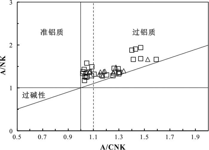 图 10 新兴花岗岩A/CNK-A/NK图解(图例同图 9) Fig. 10 A/CNK-A/NK diagram of the Xinxing granite (same legend as Fig. 9) |