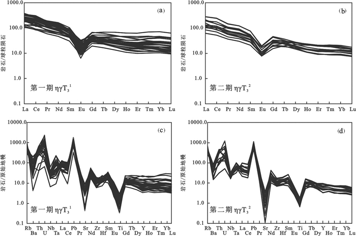 两期花岗岩稀土元素总量为139×10-6~471×10-6和116×10-6~365×10-6。在球粒陨石标准化稀土元素配分图解上(图 11a、b),均显示了轻稀土元素富集、重稀土元素相对亏损的右倾配分模式,(La/Yb)N比值分别为2.82~22.32和3.01~25.10,中等Eu负异常(分别为0.23~0.64、0.26~0.43)。在原始地幔标准化微量元素蛛网图上(图 11c、d),两期花岗岩均具有富集大离子亲石元素(Rb、U)和LREE富集,而亏损高场强元素(Nb、Ta、Zr、Hf、Ti)的特点。
