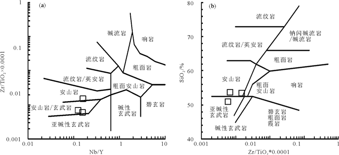 在岩石分类判别图解中,基性包体样品属于亚碱性岩石系列,成分为玄武质-安山质(图 12)。其具有右倾的稀土配分型式,无显著Eu异常(图 13a);微量元素表现为较为平坦的配分型式,具有“Nb-Ta槽”和Zr-Hf-Ti负异常(图 13b)。