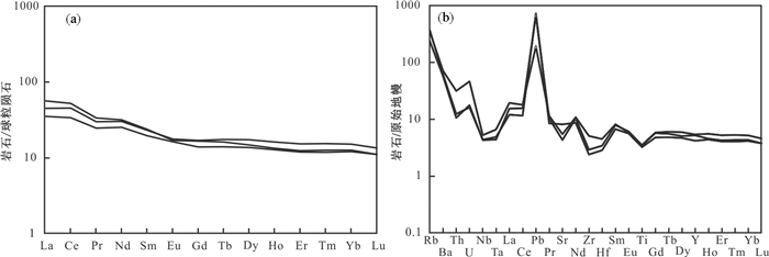 4.2 地球化学特征 4.2.1 花岗岩地球化学特征(表 1)新兴晚三叠世两期花岗岩形成时间相近、空间上密切共生,岩性以黑云母二长花岗岩为主,二者也具有相似的地球化学组成。