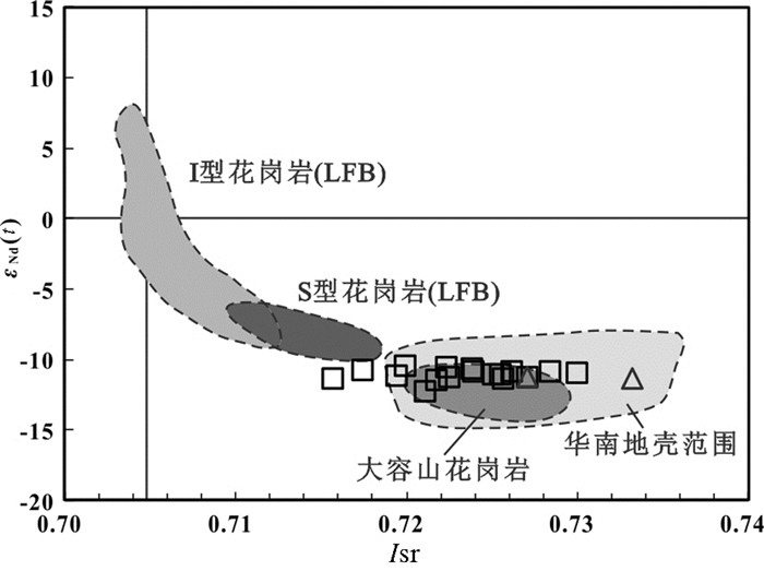 25件花岗岩样品的Sr-Nd同位素分析显示(图 14),两期花岗岩均具有高的ISr值和低的εNd(t)值,ISr变化范围较大(分别为0.71565~0.73001和0.72702~ 0.75765),而εNd(t)极为集中(分别为-11.5 ~ -10.5和-11.4 ~ -11.0),相应的Nd同位素两阶段模式年龄T2DM也集中在1.61~1.68 Ga和1.65~1.67 Ga。所有样品几乎完全落在华南地壳范围,也与大容山过铝质花岗岩Sr-Nd同位素组成类似。