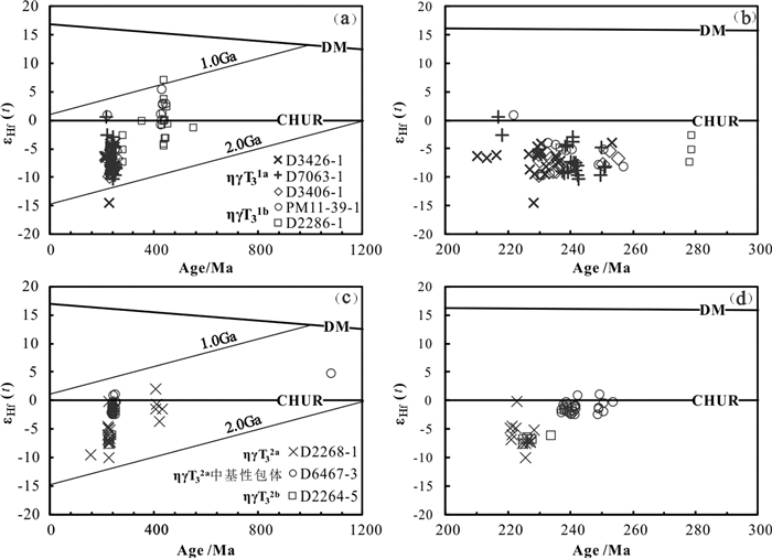 7件花岗岩和1件基性包体的锆石原位Lu-Hf同位素分析显示,晚三叠世两期花岗岩具有类似的Lu-Hf同位素组成(图 15)。花岗岩中220~240 Ma的锆石εNd(t)值分别集中在- 2.9~- 10.3和- 4.5~ -7.7,两阶段Hf模式年龄分别为1.45~1.93 Ga和1.54~1.75 Ga;花岗岩中~250 Ma的锆石εNd(t)值为-9.6~-3.9,两阶段Hf模式年龄为1.53~1.89 Ga;基性包体中~240 Ma和~250 Ma锆石的Lu-Hf同位素无明显区别,εNd(t)值为-2.6~1.0,两阶段Hf模式年龄为0.86~0.98 Ga(图 15c、d)。