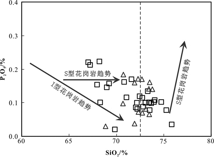 图 16 新兴花岗岩SiO2-P2O5图解(图例同图 9) Fig. 16 SiO2-P2O5 diagram of the Xinxing granite (same legend as Fig. 9) |