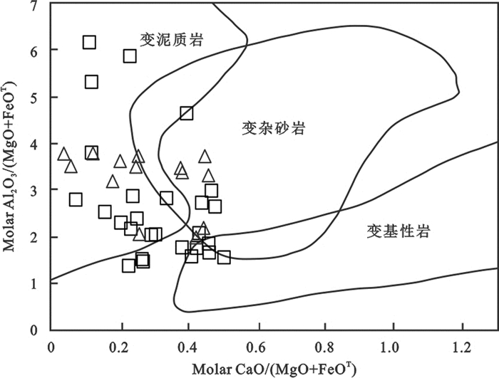 图 17 新兴花岗岩C/MF-A/MF源区判别图解(图例同图 9) Fig. 17 C/MF-A/MF diagram of the Xinxing granites (same legend as Fig. 9) |