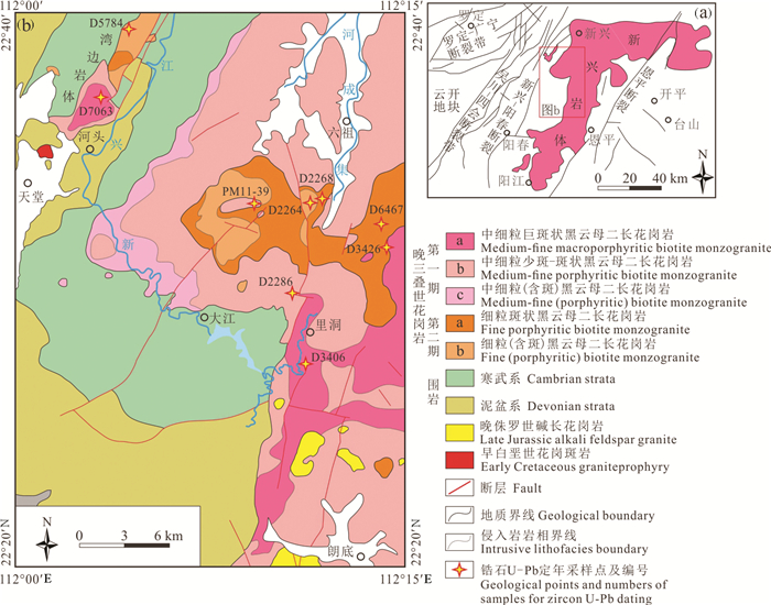 2 地质背景与岩体特征 2.1 地质特征新兴岩体出露于粤西新兴—恩平一带(图 1,图 2),总体上受NE向的新兴—阳春断裂和恩平断裂控制,为一条宽20~40 km,长达120 km的NE向大岩基,出露面积超过3632 km2(图 2a)。其西北侧见出露较小的湾边岩体(亦称湾边圩岩体、幌岗山岩体)。广东地矿局(1963)❶将新兴岩体划分为中侏罗世花岗岩侵入体;而广东地质调查院(2004)❷认为其是侏罗纪—白垩纪的复式岩体,侏罗纪为新兴岩体的主体,笔架山等单元为白垩纪侵入体。
