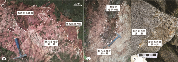 图 3 新兴花岗岩与围岩接触关系(a,b)及两期花岗岩侵入接触关系(c) Fig. 3 Contact relation between Xinxing granite and country rock(a, b); Intrusive contact of two phases granites(c) |