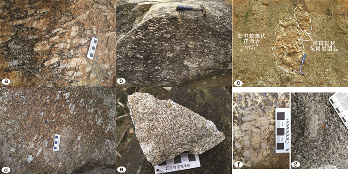 图 4 新兴花岗岩岩石学特征 a~b—细中粒巨斑状黑云母二长花岗岩中斑晶定向排列;c—多斑斑状花岗岩团包;d—细粒斑状黑云母二长花岗岩中斑晶定向排列;e—细粒黑云母二长花岗岩;f~g—钾长石斑晶环带结构 Fig. 4 Characteristics of the Xinxing granite a-b-Orientation arrange of phenocryst in medium-fine-grained megaporphyritic biotite monzogranite; c-Poly-phenocryst porphyritic granite inclusion; d-Orientation arrange of phenocryst in fine-grained megaporphyritic biotite monzogranite; e-Fine-grained biotite monzogranite; f-gZonal texture of K-feldspar |