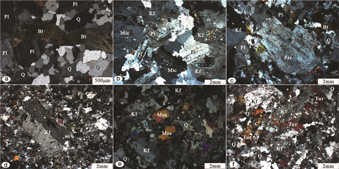 图 5 新兴花岗岩镜下特征 a—细中粒巨斑状黑云母二长花岗岩(基质部分);b—粗中粒斑状黑云母二长花岗岩(基质部分);c—细粒斑状黑云母二长花岗岩;d—细粒含斑黑云母二长花岗岩;e—细粒含斑白云母二长花岗岩;f—电气石花岗岩;Kf—钾长石;Mic—微斜长石;Per—条纹长石;Pl—斜长石;Bt—黑云母;Mus—白云母;Q—石英;Tur—电气石 Fig. 5 Microscopic photos of the Xingxing granite a-Matrix of medium-fine grained megaporphyritic biotite monzogranite(groundmass); b-Coarse-medium grained porphyritic biotite monzogranite; c-Fine grained porphyritic biotite monzogranite; d-Fine grained porphyritic biotite monzogranite; e-Fine grained porphyritic mica monzogranite; f-Tourmaline granite. Kf-k-Felspar; mic-Microcline; per-Perthite; pl-Plagioclase; bt-Biotite; mus-Muscovite; q-Quartz; tur-Tourmaline |