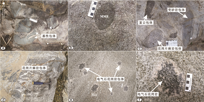 新兴花岗岩中包含各种类型包体(图 6),其中以暗色微粒包体(MME)和壳源包体最为常见,包体分布尤以新兴太平南部的肇庆田—松根一带最为集中。肇庆田见椭球状、残块状基性包体(图 6a),大小为5 cm×8 cm~15 cm×30 cm。其北侧不远的松根一带见大量不同类型的壳源包体(图 6c、d),岩性以花岗片麻岩、变质长石石英砂岩、富云包体为主,多呈混圆状,大小3~40 cm,可能为花岗岩源区岩石或捕获自围岩。里洞田排见大量电气石花岗岩包体产出(图 5f,图 6e、f),团包直径4~10 cm,团包核部主要由电气石、石英和少量长石组成,边部则主要为长石和石英,形似“白眼球”。这些包体无变形,附近也未见断层或热液脉体,推测为岩浆演化晚期流体活动的遗存。