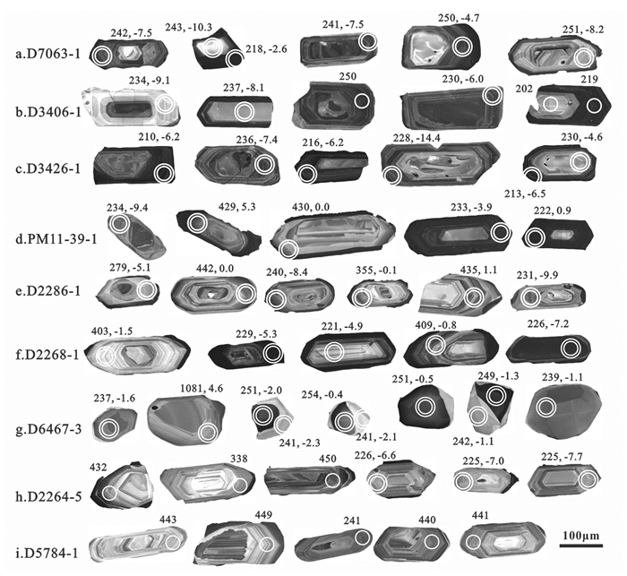 4.1.1 锆石特征8件花岗岩样品中分选出的锆石颗粒均为柱状自形晶(图 7),锆石颗粒长轴为80~300 μm,长宽比1∶1~3∶1,CL图像上可见锆石发育核幔边结构,其中核部锆石发光特征、环带特征各异,属捕获锆石、继承锆石;幔部则发育清晰的岩浆结晶环带,为岩浆结晶锆石;部分锆石发育高Th、U含量的黑色边部,可能为晚期热液活动的记录。1件基性包体样品(D6467-3)中分选出的锆石颗粒为短柱状,锆石颗粒长轴100~200 μm,长宽比集中在1∶1,具宽板状、补丁状CL特征,与典型中基性岩浆中生长的锆石类似,这一样品中部分锆石具核边结构,核部为暗色,边部为宽板状环带特征,核部与边部界线截然(图 7g)。
