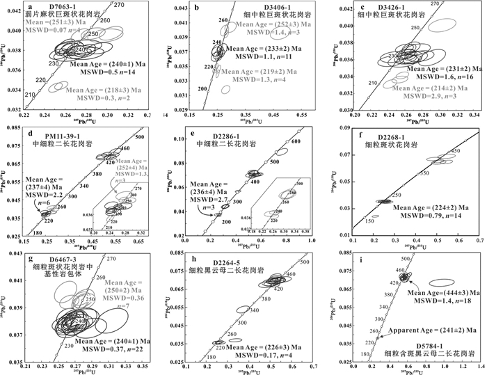 (3)3件花岗岩(D7063-1、D3406-1、PM11-39- 1)和1件包体(D6467-3)中出现一组250~252 Ma的锆石(图 8a、b、d、g)。基性包体样品D6467-3中的该期锆石以典型的继承核产出,其他花岗岩中该期锆石则多数为单独矿物。结合Th/U比值、CL和REE特征判断其为岩浆成因锆石,可能来源于源区继承或围岩捕获(图 7),推测是早期岩浆活动的记录。