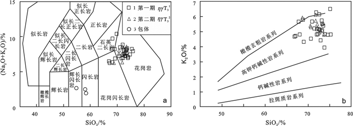 图 9 新兴花岗岩TAS图解(a)和SiO2-K2O图解(b) Fig. 9 TAS diagram(a) and SiO2-K2O diagram(b) of the Xinxing granite. 1-The first phase(ηγT13)of Xinxing granites; 2-The second phase(ηγT23)of Xinxing granites; 3-Enclaves in Xinxing granites |