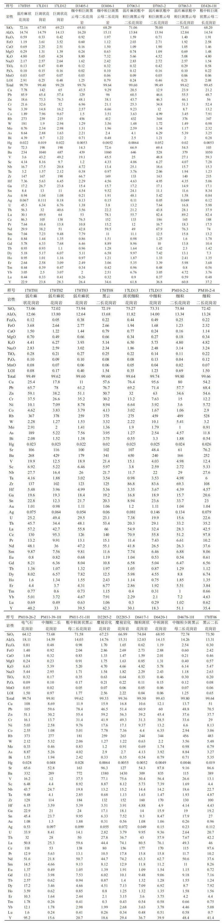 样品的全岩地球化学分析测试均在武汉地质调查中心中南矿产资源监督检测中心完成。其中,主量元素采用XRF法,测试过程中根据同时测定的BHVO-1、AGV-1和G-2等标样来监测测试精度,分析误差 < 2%。稀土微量元素采用ICP-MS法完成,Sr-Nd同位素利用Triton TI完成,详细的样品消解处理过程、分析精密度和准确度同程顺波等(2012)。
