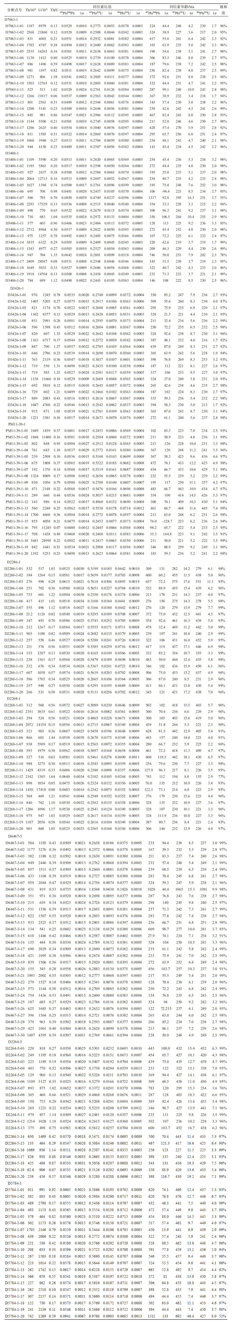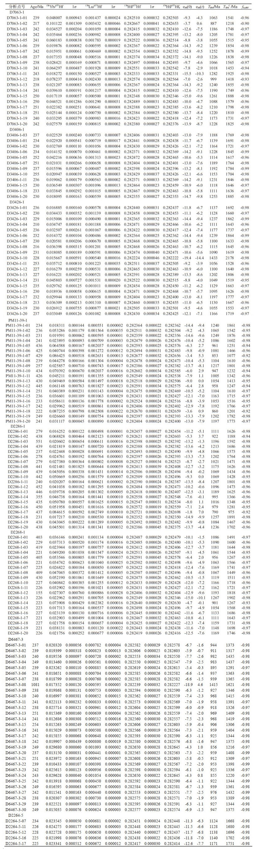 锆石U-Pb同位素定年和原位Lu-Hf同位素分析在武汉上谱分析实验室利用COMPexPro 102 ArF 193 nm激光+Agilent 7900 ICP-MS系统完成,锆石U-Pb定年束斑直径为32 μm,原位微区锆石Hf同位素测试激光剥蚀所用束斑直径为44 μm。U-Pb分馏根据锆石标样91500来校正,采用GJ-1和Ple标样作为内标以控制分析精度,采用ICPMSDataCal9.9对分析数据进行处理,利用ComPbCorr#3-151程序完成普通铅校正,年龄计算及谐和图绘制采用Isoplot 4.11完成。详细仪器条件和数据获得详见Zong et al. (2017)。