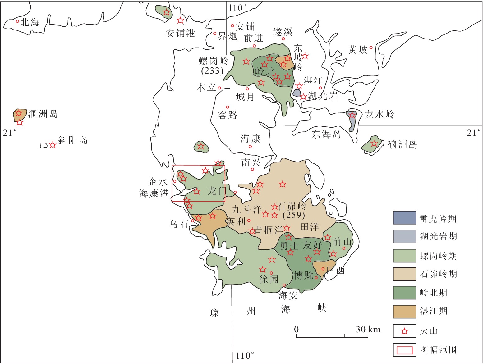 图 1 雷州半岛第四纪火山活动分期及企水镇幅(F49E020008)地理位置图(据黄镇国等, 1993修改) |