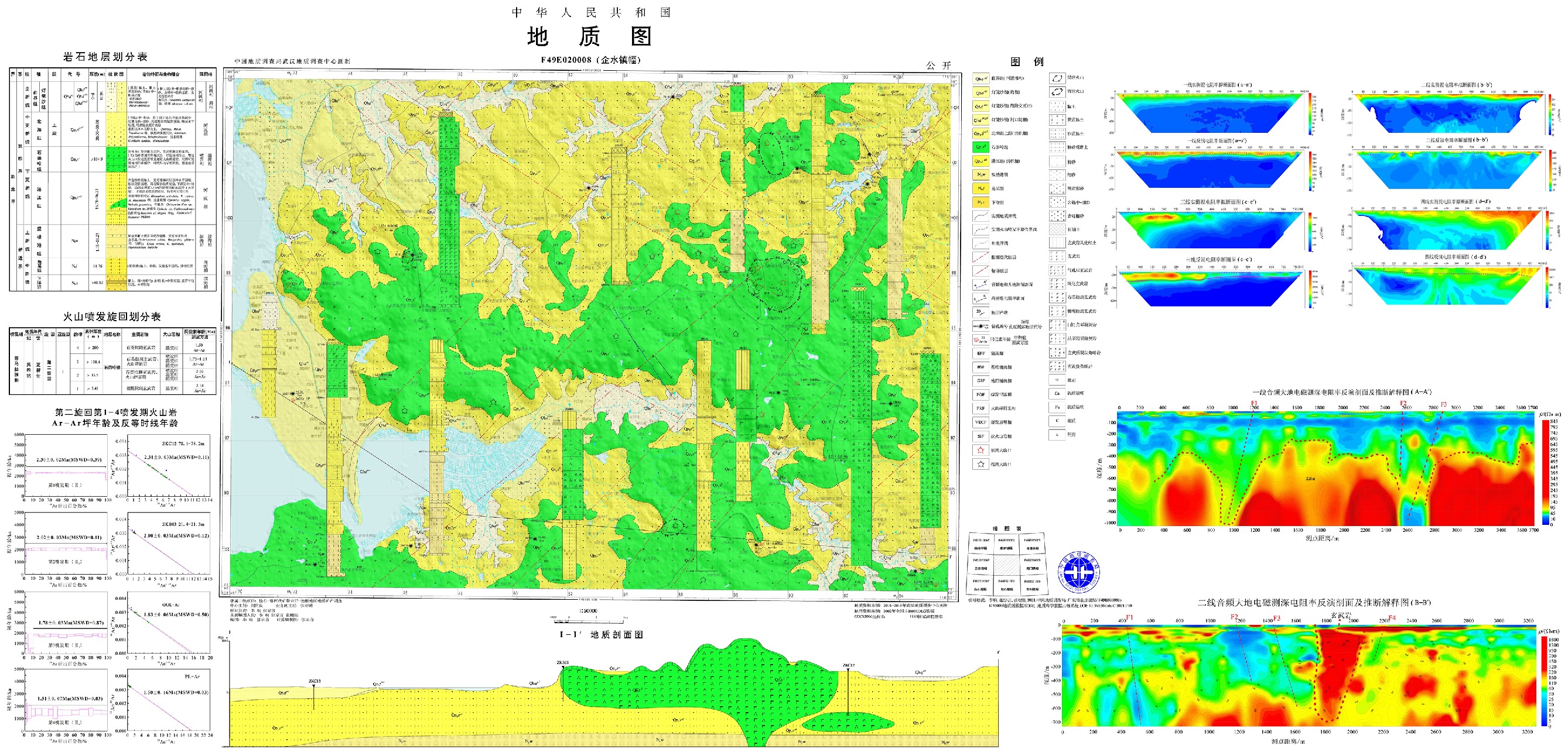 角图包括综合柱状图、火山活动期次划分、Ar−Ar年龄、图切剖面、物探反演剖面图等。