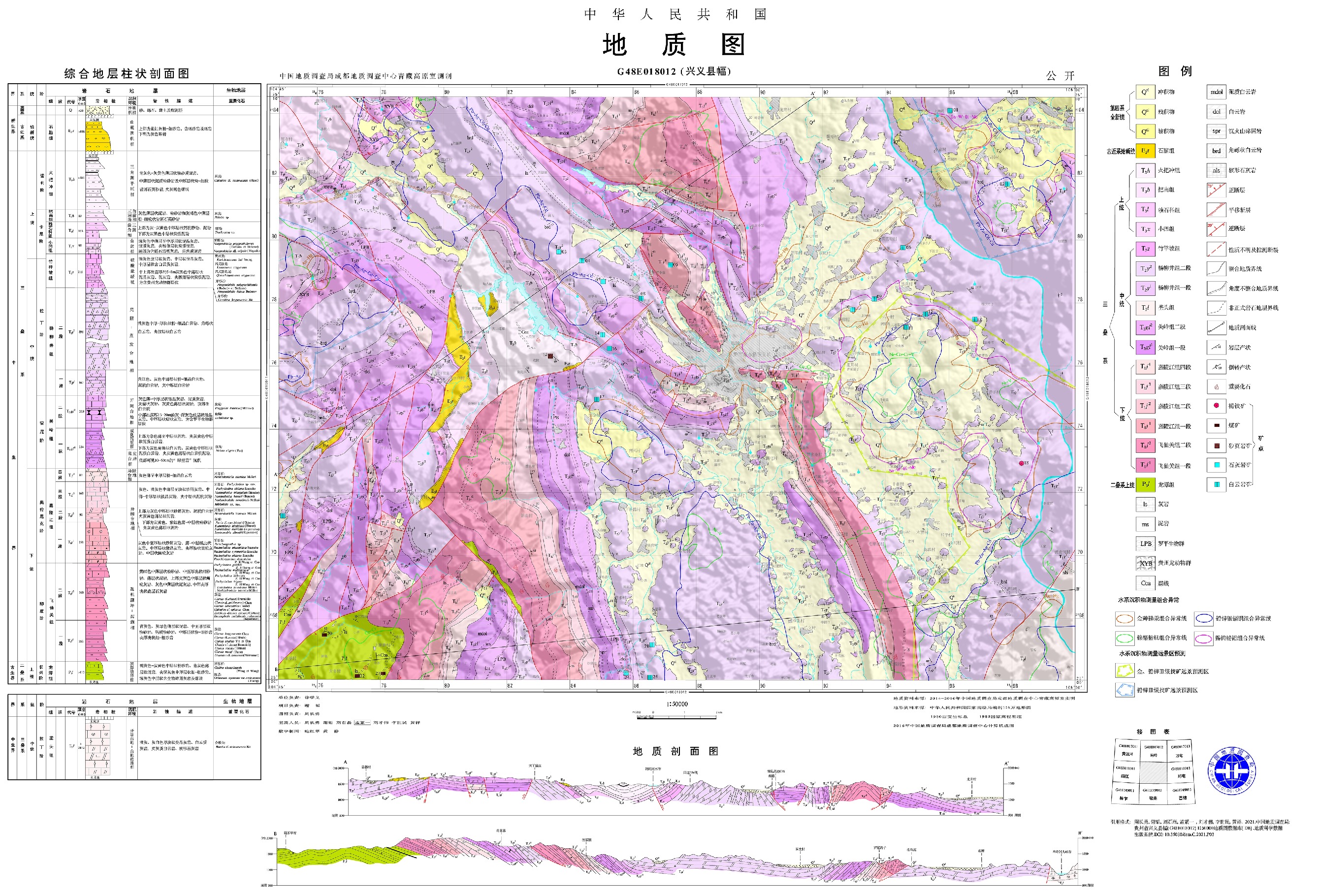 贵州省兴义县幅1∶50 000地质图按照《区域地质调查总则(1∶50 000)》(DZ/T 0001—1991)、《1∶50 000区域地质区域矿产调查技术要求》(DD 2006)和《地球化学普查规范(1∶50 000)》(DZ/T 0011—2015)为基本要求,在充分收集、综合分析利用已有地质矿产资料基础上,以现代沉积学理论为指导,综合应用了遥感、路线地质调查、实测剖面、大比例尺填图和地球化学测量等多种手段相结合的方法,采用数字填图(PRB)技术方法,进行构造–岩性填图,突出特殊地质体和地层及非正式填图单位的表达。数据库建库严格按照《数字地质图空间数据库标准》(DD 2006—06)的要求,地理底图采用国家测绘局最新地理数据,应用已有的技术标准和数字填图系统(DGSS) 及MapGIS等计算机软件进行数据处理。