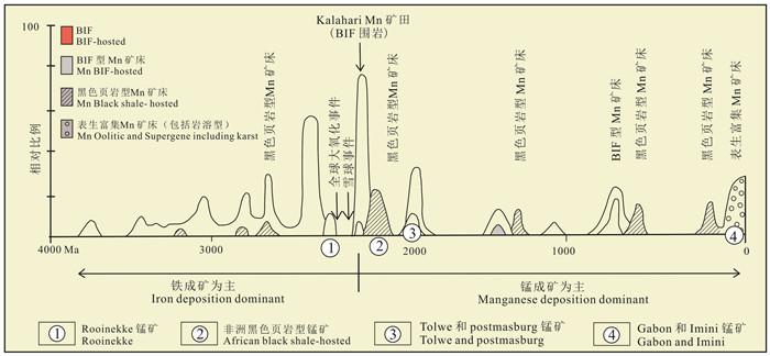 5.1 锰矿床成矿时代从全球角度看,非洲锰矿床形成时代较早(图 10),且集中出现在2.2~2.0 Ga(本文第2节),都是在全球大氧化事件(GOE)(~2.35 Ga)之后形成的(图 10)。太古宙和古元古代早期有大量的BIF铁建造早于锰矿床形成。这是因为在溶液中,锰比铁更易溶,需要比水溶液中的二价Fe更高的氧含量才能将溶液中的二价Mn转化为不溶的三价或四价Mn-羟基氧化物,与氢氧化铁沉淀形成铁锰建造(Beukes and Gutzmer, 2008)。而南非的洛音克(Rooinekke)锰矿床赋存的铁锰建造却是在大氧化(GOE)之前形成的(图 10),Konhauser(2008)研究认为,氧化还原条件对锰沉积具有重要意义,而在大氧化(GOE)之前,由于局部一些游离氧系统的存在,可能是洛音克(Rooinekke)锰矿床Mn-羟基氢氧化物大量沉淀的重要因素。