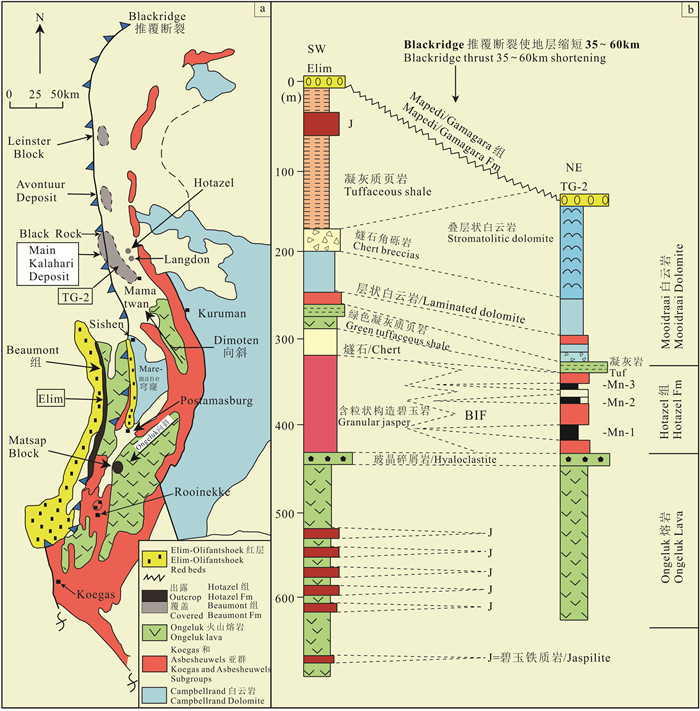 图 2 南非西格里夸兰(Griqualand)德兰士瓦超群区域地质图(a,显示了卡拉哈里锰矿田(KMF)和黑山(Black Ridge)逆冲断裂的分布)以及卡拉哈里锰矿田(KMF)横向剖面示意图(b)(据Cairncross and Beukes, 2013) Fig. 2 Regional map of the Transvaal supergroup in Griqualand west showing the distribution of the Kalahari manganese field and Black Ridge thrust fault (a) and schematic diagram indicating lateral of the Kalahari manganese field (b) (after Cairncross and Beukes, 2013) |