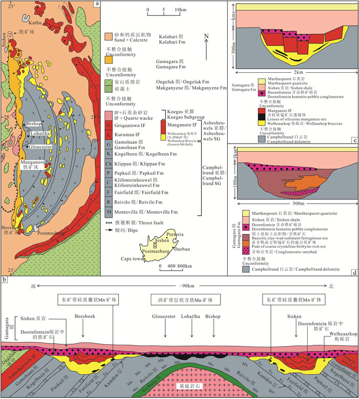 图 3 马尔曼(Maremane)穹隆地质图(a)、N-S向横剖面示意图(b)、东部矿带(Manganore地区)的喀斯特(岩溶)地区锰矿床(c)及西部矿带(Lohatlha地区)的喀斯特(岩溶)矿床(d) 在图d中请注意,在约2.0 Ga Gamagara/Mapedi红层底部为不整合接触,Sishen型高品位BIF赤铁矿铁矿床覆盖了东部矿带的锰矿床(据Gutzmer and Beukes, 1996b;Cairncross et al., 1997) Fig. 3 Geological map of the Maremane dome(a), schematic N-S cross section(b), Karst-hosted Postmasburg manganese deposits along the Eastern Belt (Manganore area) (c), and Western Belt (Lohatlha area) (d) Note in (d) that Sishen-type high-grade BIF-hosted hematite iron deposits overlie the manganese deposits of the Eastern Belt below the unconformity at the base of the ~2.0 Ga Gamagara/Mapedi red bed succession (modified from Gutzmer and Beukes, 1996b; Cairncross et al., 1997) |