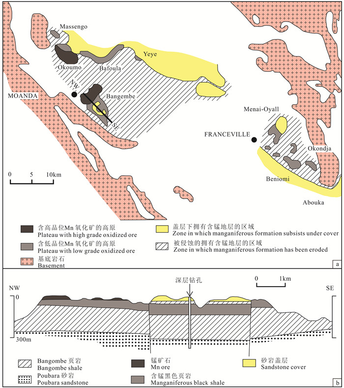 图 4 加蓬Francevillian锰矿区地质简图(a)和莫安达(Moanda)附近的Bangombe高原的横剖面(b)(据Nicolas et al., 2016) Fig. 4 Simplified geological map of the Francevillian succession in Gabon(a) and cross section of the Bangombe plateau near Moanda (b) (after Nicolas et al., 2016) |