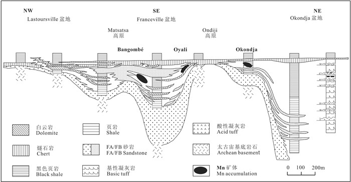 弗朗西斯维利亚锰矿带的矿体赋存于基本未发生变质和变形作用的弗朗西斯维利亚(Francevillian)超群的班戈姆贝(Bangombe)组的泥质黑色页岩(2.3~2.0 Ga)中,该页岩覆盖在刚果克拉通西北部的太古宙结晶基底之上(Weber, 1973)。含锰岩系厚约300 m,其中碳酸盐岩层厚70 m,岩系底部为含铀的长石砾岩,含锰碳酸盐岩向东过渡为薄层低品位铁矿层,两者呈互层产出,锰矿层为铁建造和黑色页岩之间的边缘相,而Bangombe高原区缺失铁建造(Nicolas et al., 2016)。