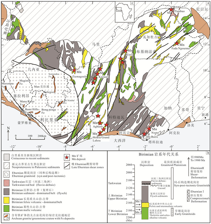 图 6 西非比利姆(Birimian)岩系的简化地质图(据Baratoux et al., 2011) 显示了以火山-沉积岩为主的造山带、曼(Man)克拉通和赋存在黑色页岩型的碳酸盐/石英锰榴岩锰矿床的位置 Fig. 6 Simplified geological map of the Birimian succession in West Africa (after Baratoux et al., 2011) showing major volcanic-and sediment-dominated orogenic belts, the Man Craton, tectono-sedimentary development of the successionand location of black shale-hosted carbonate/gondite manganese deposits |