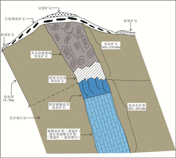 该成矿带锰矿床上部的表生氧化锰矿石都是由原生碳酸锰(主要是菱锰矿)氧化而成,其中原生碳酸锰矿石中锰含量为20%~30%(图 7)。表生氧化锰矿体厚度最大可达70 m,常形成正地形山脊(Swindell, 2015),矿石品位高,含Mn 45%~50%,质地从松散状、葡萄状、块状到层状和脉状,通常由Mn氧化物矿物组成,如硬锰矿、软锰矿、隐钾锰矿和六方锰矿。在石英锰榴岩之上发育的锰矿体含有褐锰矿(Swindell, 2015)。表生氧化锰矿体常被豆状锰矿石和锰铁红层覆盖,且往往被冲积型含锰砾石和碎块所包围,使得氧化物盖层常呈蘑菇形(图 7)。细碎屑矿石(球状团块和小球团是局部风化和剥蚀的结果)总是沿着山坡两侧呈冲击裙发育(图 7)。表生盖层氧化锰矿体规模一般都较小(很少>10~20 Mt),Mn / Fe比高。